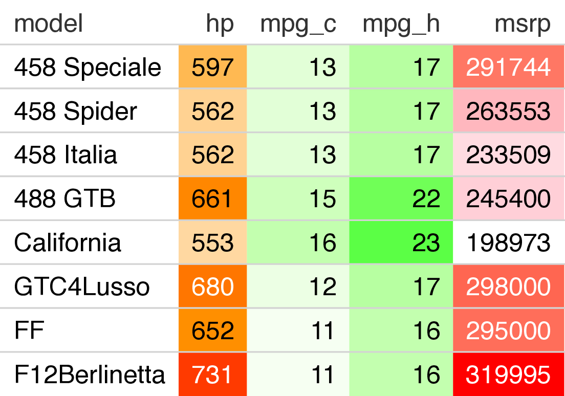 This example uses cell background colors to encode ranges of values.