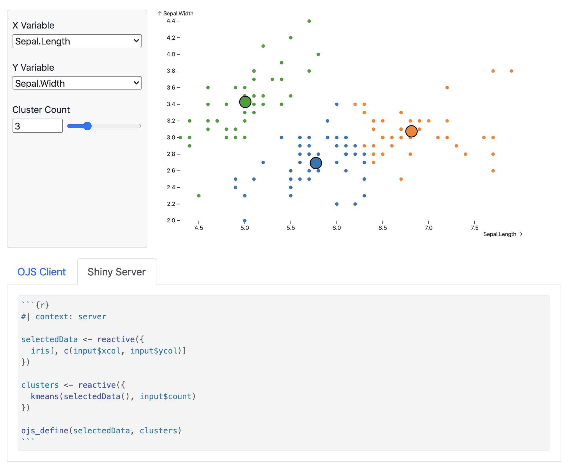 Here is the K-Means Clustering example from the Shiny Gallery implemented with an OJS client and Shiny Server:
