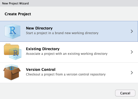A section of the 'New Project Wizard' menu from Rstudio. This section is titled 'Create Quarto Website'. The Quarto logo is displayed on the left. On the right are fields for 'Directory name', and 'Create project as subdirectory of:'. Underneath that are options for 'Engine'. The option for 'Engine' is set to 'None'. Underneath are options for 'Create a git repository', and 'Use visual markdown editor'.There are buttons for 'Create Project' and 'Cancel' arranged side-by-side in the bottom right of the window. There is an option to 'Open in new session' in the button left corner.